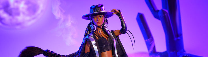 The Barbie Fashion Frontier series features out-of-this-world looks that blend Wild West and space-chic for a totally fresh feel. The second doll in the series shines in a night-sky inspired look, with a black crop tank, shimmering fringed cape, and matching silver starburst-patterned chaps. She elevates the celestial style with a rhinestone-buckle belt, leather arm cuffs, and a wide-brimmed hat that instantly rocket her to star status.