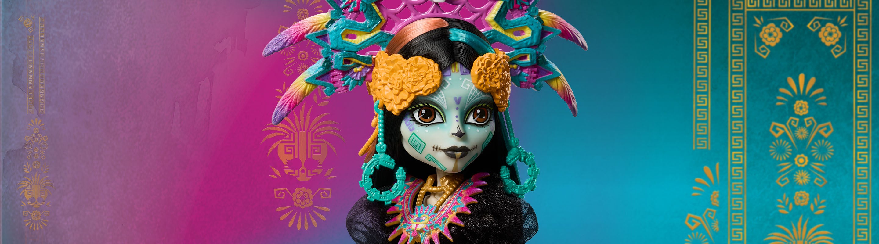 Monster High alum Skelita Calaveras has put her fashion design skills to work on her most faboolous look yet. In honor of Día de Muertos, her favourite howliday of the year, she wears a gown inspired by her Aztec scare-itage. Splashes of vibrant colour light up her black satin dress, and her elaborate headdress depicts Quetzalcóatl, the powerful Feathered Serpent associated with wisdom and creation. Skelita Calaveras is a beautiful keepsake for anyone looking to honour this season of remembrance.