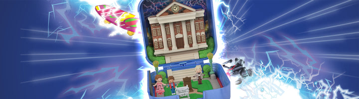 Time travel goes tiny with this iconic Polly Pocket x Back to the Future collaboration. The compact exterior features an electric image of the Time Machine next to Marty and Doc Brown. Open to reveal iconic movie locations and three dolls (Marty McFly, Doc Brown, and Lorraine McFly) who can peg into various locations, including the dance floor, the roof, and Marty’s hoverboard. Reenact movie moments like lightning striking the clock tower or Marty’s performance at the dance.